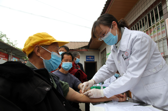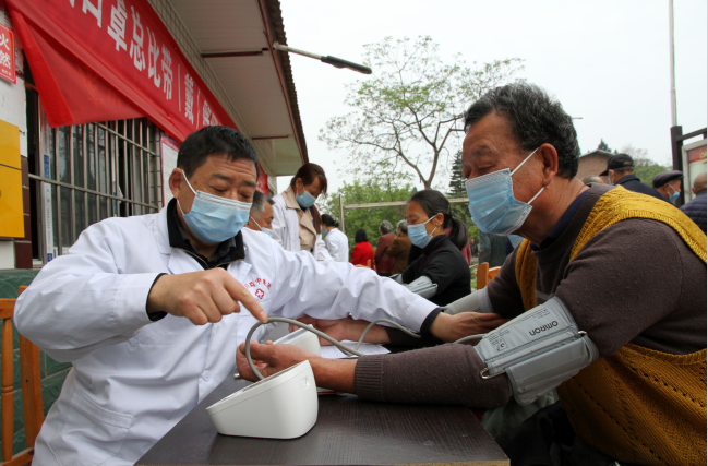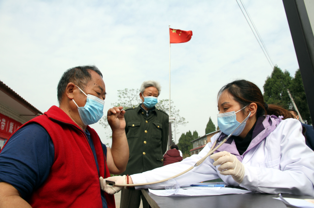3月25日,在内江市东兴区白合镇交通村,医护人员上门为当地老人免费查体看病。