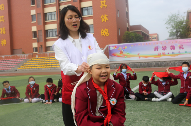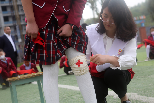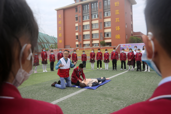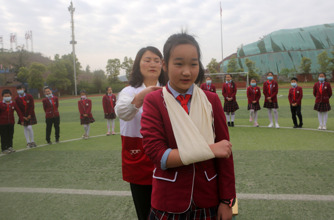 2022年3月28日,四川省内江市东兴区实验小学组织开展“安全教育进校园”主题活动,区红十字会的志愿者正在为学生讲解急救知识。