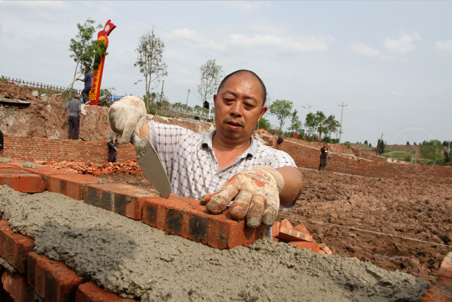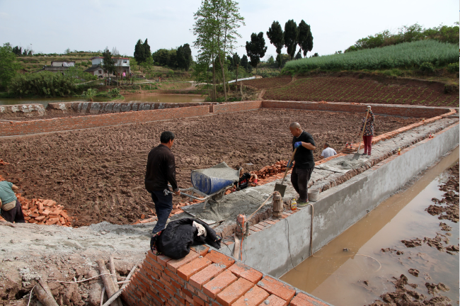3月28日,工人在内江市东兴区郭北镇青台村修建小型水利设施。