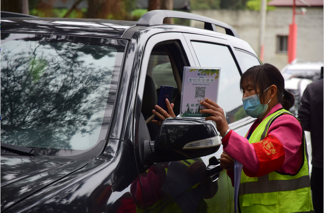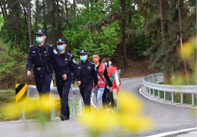 2022年4月3日,在位于内江市东兴区郭北镇的长江森林公园内,森林公安民警和林区工作人员正在查验过往车辆。