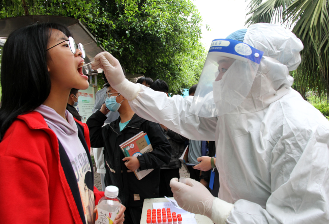 医护人员为内江市第五初级中学校学生进行核酸采样