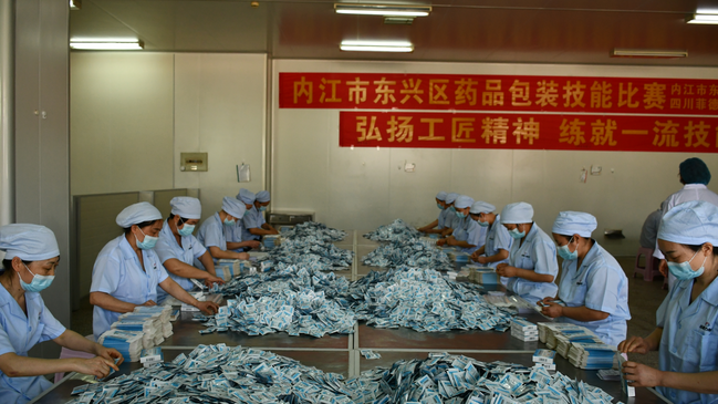 4月7日,四川菲德力制药有限公司车间里气氛紧张激烈,药品包装技能比赛正如火如荼地展开。
