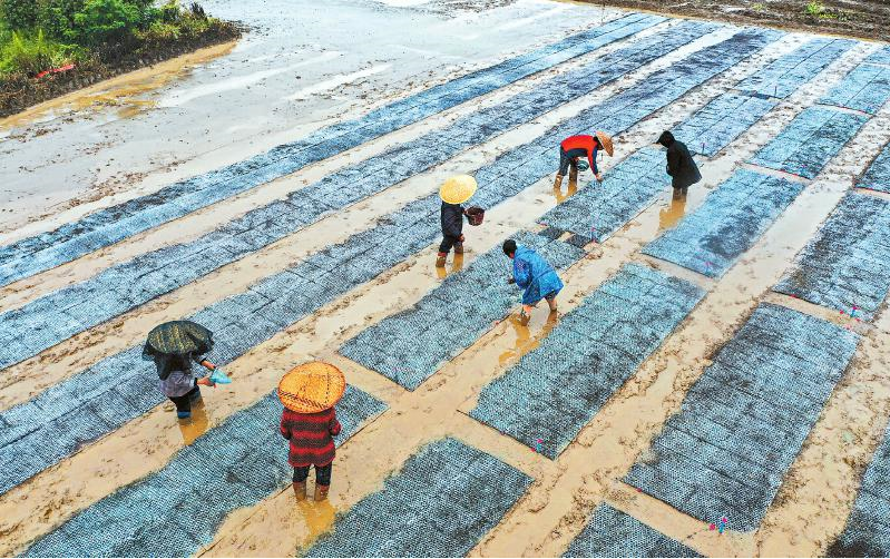 四月十四日,在天府现代种业园,农户忙着播种育秧。一块一亩地的秧田,