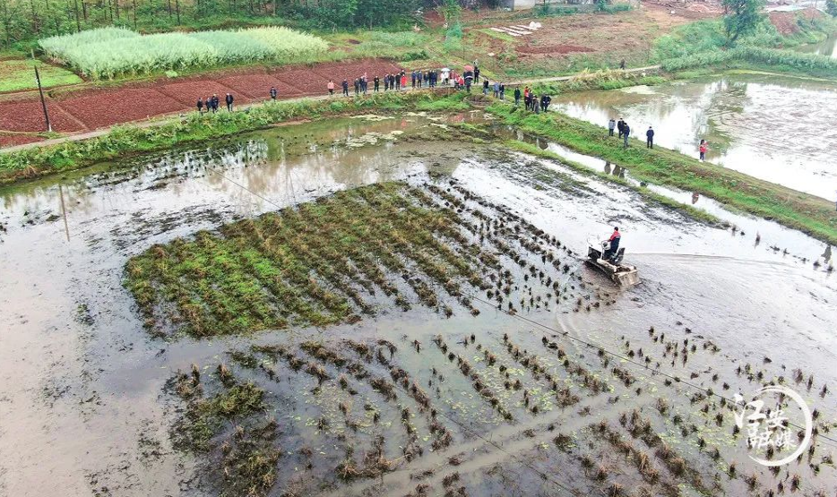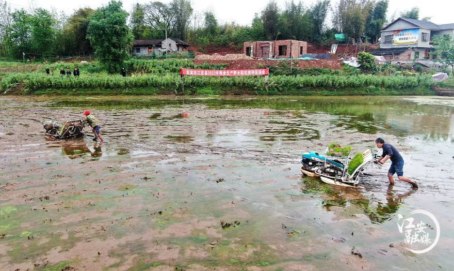 近日,在江安县2022年粮食生产暨水稻机插秧现场会上,一台旋耕机在水田里来回作业,不一会儿就平整完毕。而在另一角,两台水稻高速插秧机来回穿梭,在田里快速、整齐、均匀地插秧,栽下一行行新绿。