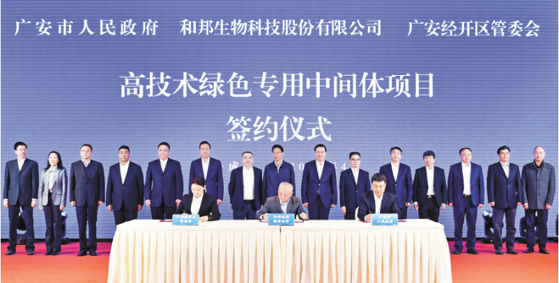 4月18日上午,广安市人民政府、四川和邦生物科技股份有限公司、广安经开区管委会高技术绿色专用中间体项目签约仪式在成都举行。省政协副主席钟勉见证签约,市委书记张彤、四川和邦集团董事局主席贺正刚致辞。市委副书记、市长赵波主持签约仪式,省政府副秘书长刘全胜、市人大常委会主任张力、市政协主席单木真见证签约。四川和邦生物科技股份有限公司董事长曾小平介绍项目情况。
