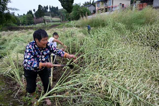 4月18日,在内江市东兴区椑木镇长滩社区,当地农民正在收割油菜。