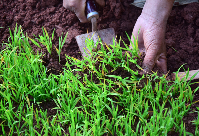 村民正在育秧苗床中取苗