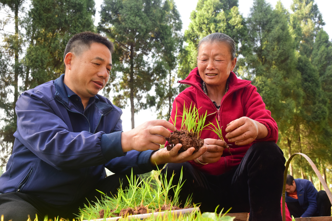 技术人员(左)正指导村民选苗