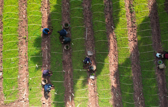 村民正在育秧苗床中取苗 (无人机照片)