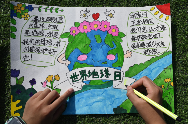 2022年4月21日,在四川省内江市东兴区实验小学,学生在展示自己创作的世界地球日主题绘画作品。