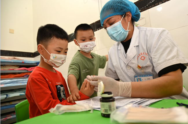 医护人员为该园幼儿进行血液检查