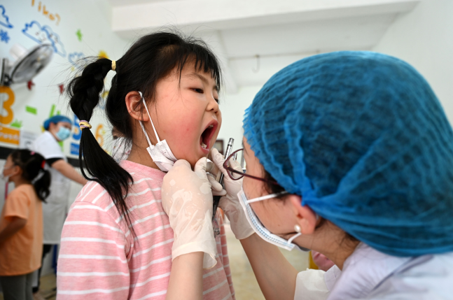 医护人员为该园幼儿检查口腔和牙齿