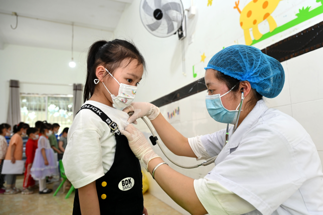 医护人员为该园幼儿进行内科检查