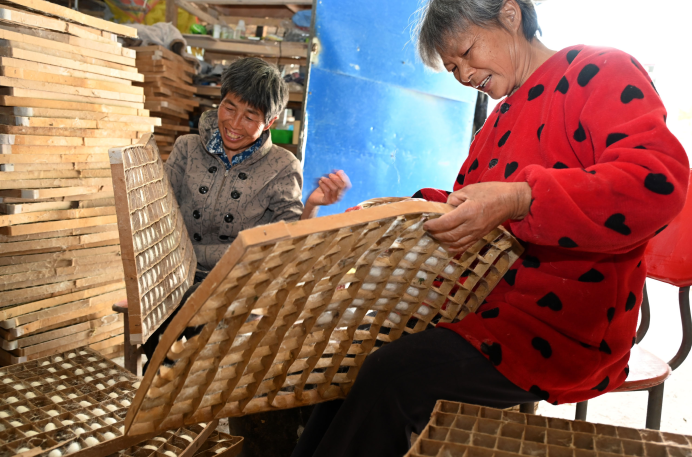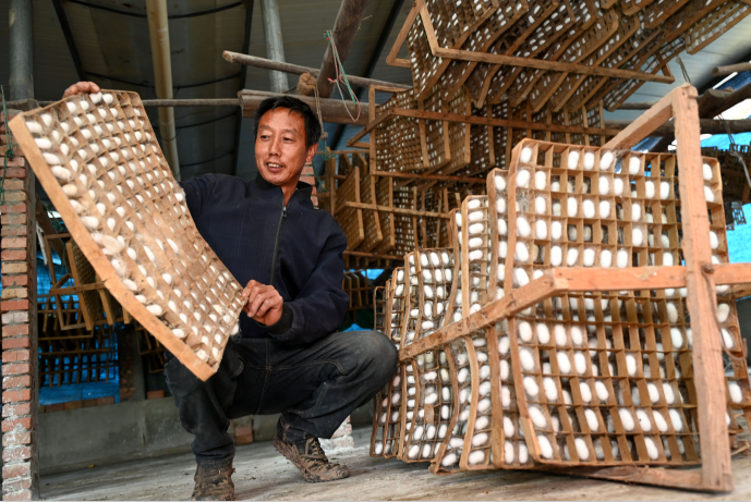 内江市东兴区双才镇芋河村蚕农正在摊晾蚕茧