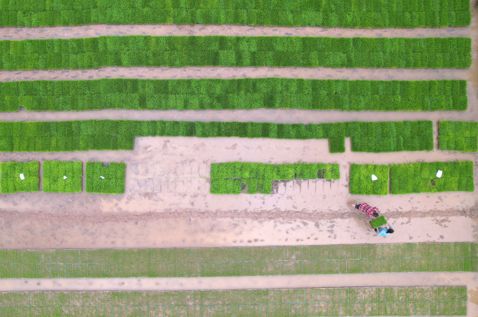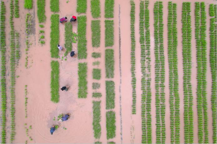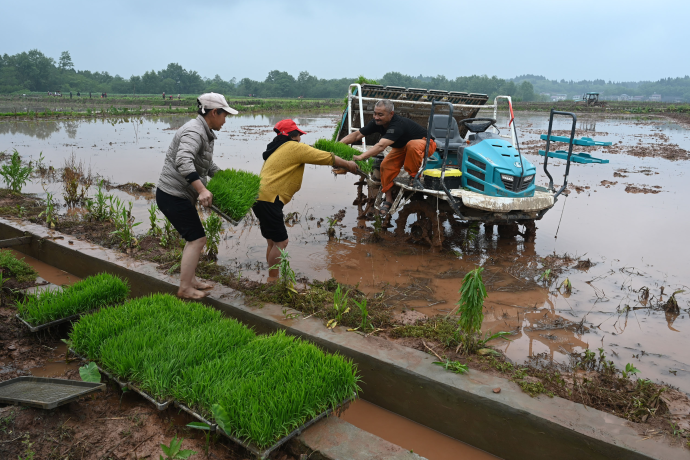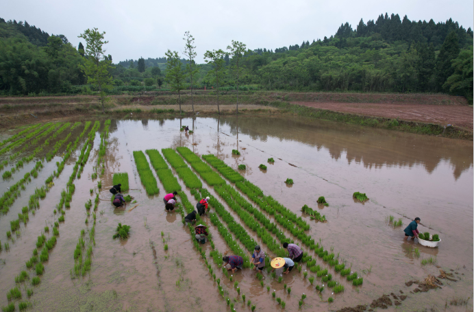 小满节气将至,四川省内江市东兴区农民抢抓农时,及时耕整水田,抢栽水稻秧苗,田野里一片繁忙景象。