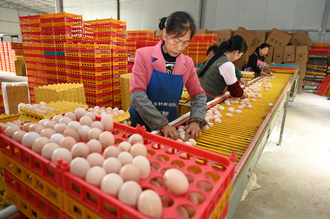 当地农户正在流水线上捡拾鸡蛋,准备装箱外运