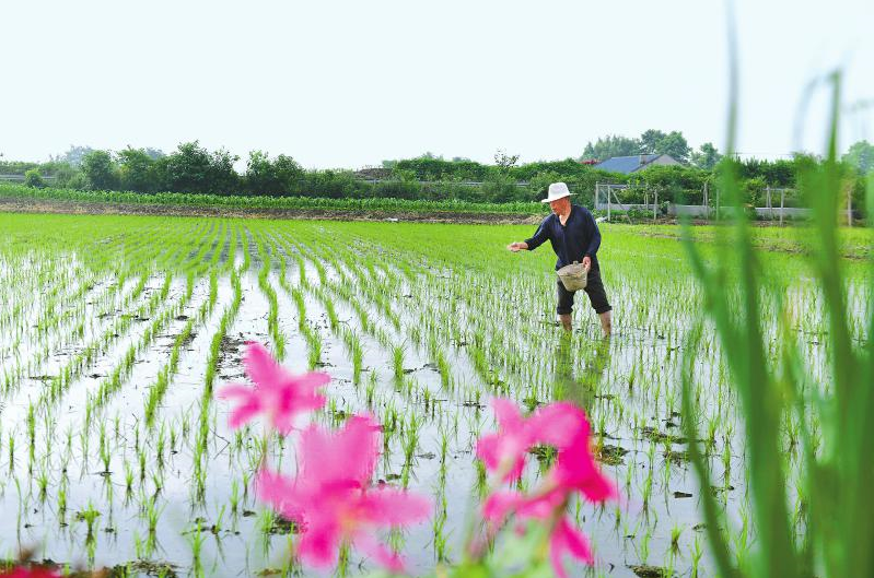 6月5日,绵竹市富新镇新民路社区,一名农户给秧苗施肥。王平 摄(视觉四川)