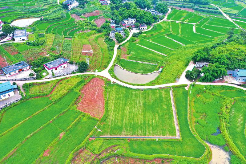 6月6日航拍的泸州市龙马潭区胡市镇黄桷村高标准农田项目基地“稻蟹(鱼)共养示范区域”。杨尚威 摄(视觉四川)