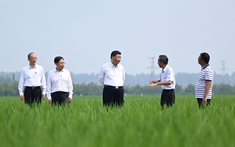 6月8日,中共中央总书记、国家主席、中央军委主席习近平在四川考察。这是8日上午,习近平在眉山市东坡区太和镇永丰村高标准水稻种植基地考察,了解水稻试验育种和种植推广情况。新华社记者 谢环驰 摄