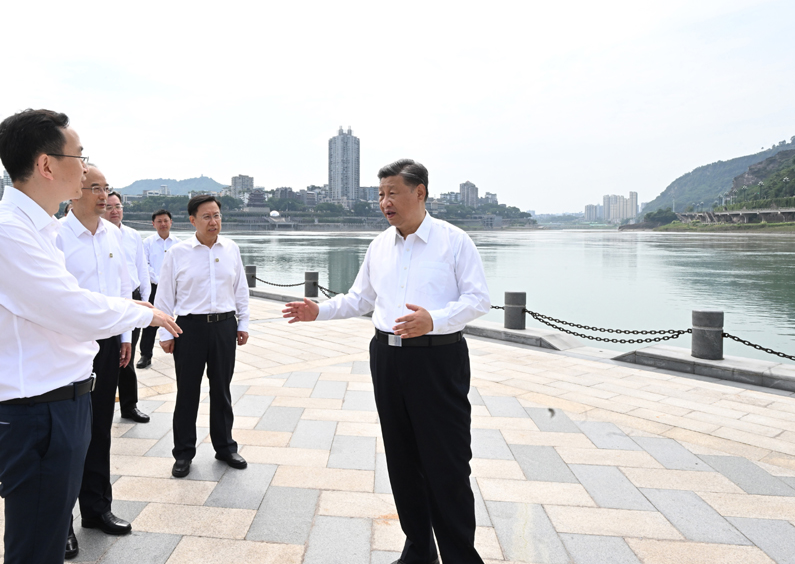 6月8日,中共中央总书记、国家主席、中央军委主席习近平在四川考察。这是8日下午,习近平在宜宾市三江口考察,听取当地推进长江流域生态修复保护等情况汇报。新华社记者 李学仁 摄