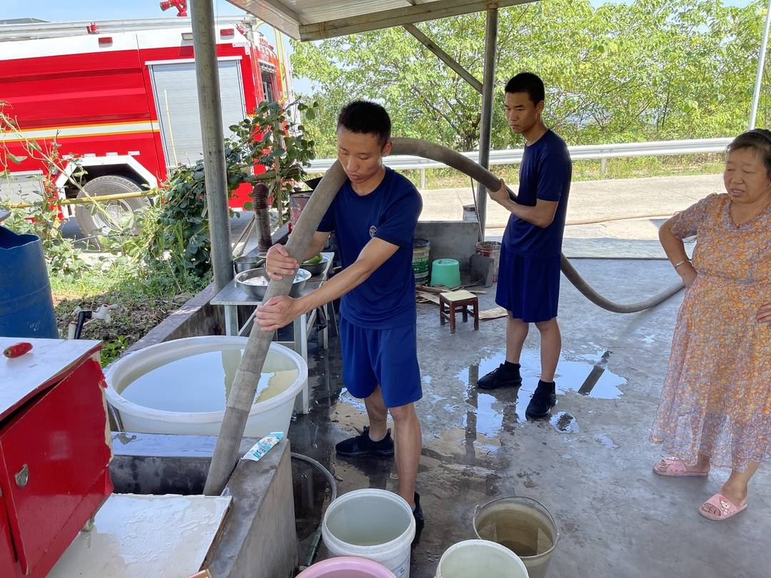 黄舣镇界牌村部分农户住家位置较高,因旱情出现饮水困难,江阳区消防救援大队海普路消防救援站立即开展送水行动,缓解了50余户村民日常生活用水以及40余头牲畜饮水困难。“这么热的天气,感谢你们大老远来给我们送水!”看到清澈干净的饮用水,村民感激之情溢于言表。