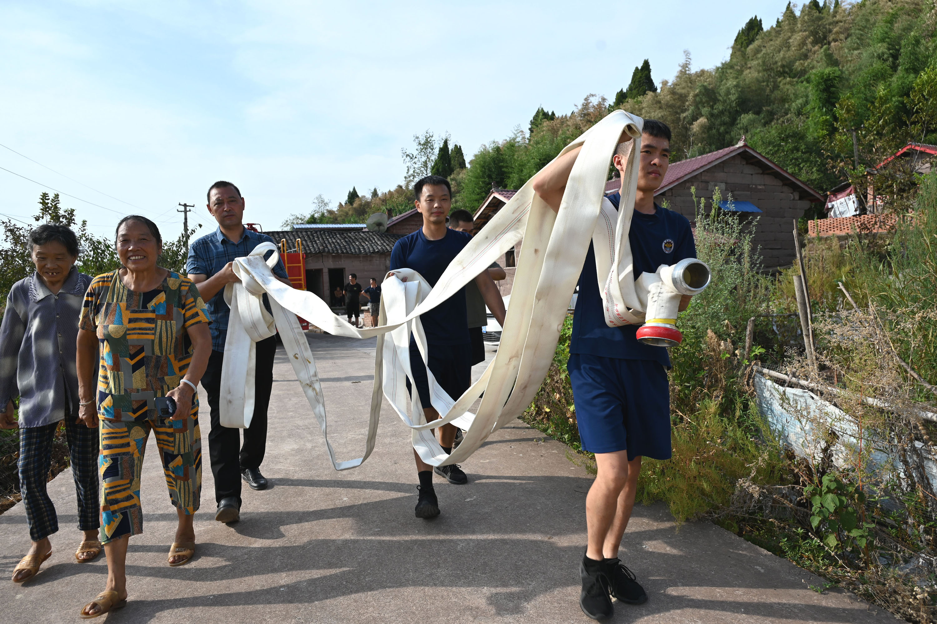 消防救援人员正在将放水管道送往群众家门口