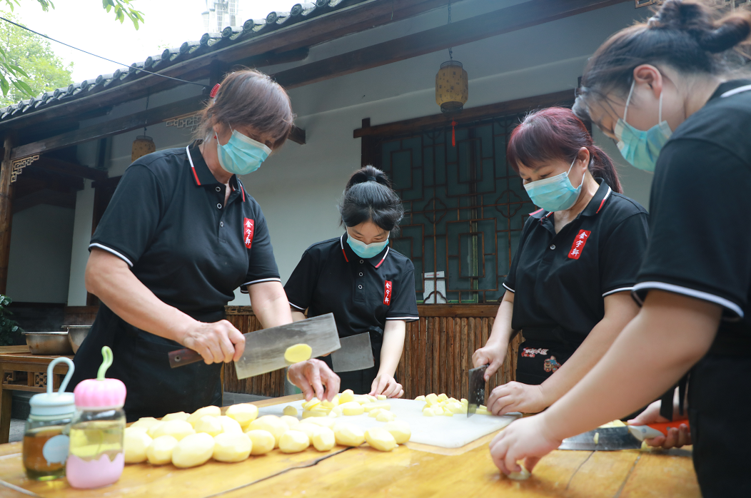 8月29日下午,记者在龙马潭区鱼塘街道的一爱心餐厅里看到,工作人员正马不停蹄地切菜、炒菜、分餐,忙得热火朝天,赶着准备500余份爱心晚餐。
