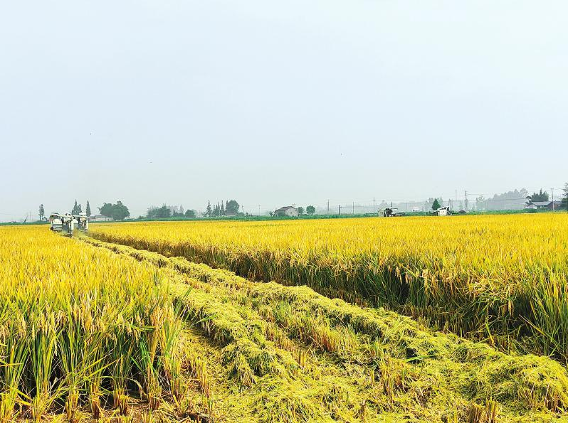 9月10日10时,在邛崃市十万亩高标准农田粮油产业示范园千亩核心区内,11台收割机开足马力来回穿梭。收割、脱粒、粉碎稻秆……不一会儿,收割后的稻谷装满货车,颗粒归仓。