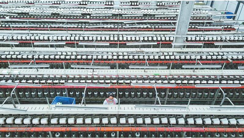 近日,雅摩尔服饰公司纱线生产车间,工人正在处理异常断纱锭位。张宝林 摄(视觉四川)