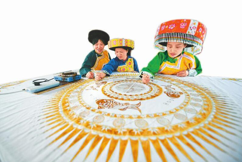 泸州市古蔺县箭竹苗族乡团结村7社的苗族工人正在对蜡染手工艺品进行画蜡。刘传福 摄(视觉四川)