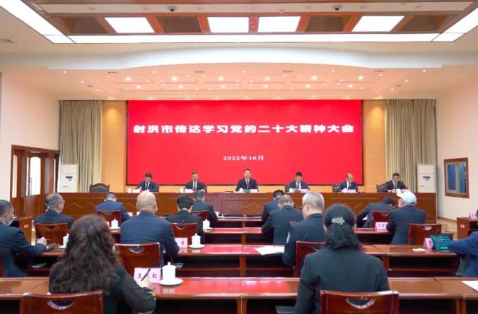 10月26日,射洪市传达学习党的二十大精神大会召开,传达学习党的二十大精神和四川省传达学习党的二十大精神大会精神以及遂宁市传达学习党的二十大精神大会精神,对全市学习宣传贯彻党的二十大精神进行部署。遂宁市委常委,射洪市委书记谭晓政出席会议并讲话。他强调,学习宣传贯彻好党的二十大精神,是当前和今后一个时期的首要政治任务。全市上下要自觉把思想和行动统一到党中央和省委、遂宁市委决策部署上来,坚决维护习近平同志党中央的核心、全党的核心地位,全面贯彻习近平新时代中国特色社会主义思想,弘扬伟大建党精神,自信自强、创新创造,为全面建设社会主义现代化射洪而团结奋斗,在新的赶考之路上向历史和人民交出新的优异答卷。