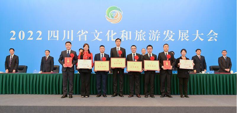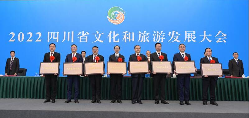 会上,省委常委、宣传部部长郑莉宣读第四批天府旅游名县、第四批天府旅游名县候选县、2022年“金熊猫”奖先进集体和先进个人、第二批天府旅游名牌、第三批文化旅游产业优秀龙头企业、前三批天府旅游名县年度考评表现突出单位名单。王晓晖、黄强等向获奖者代表授牌颁奖。阆中市、通江县、犍为县罗城镇综合文化站、明宇实业集团、广安市广安区协兴镇作交流发言。