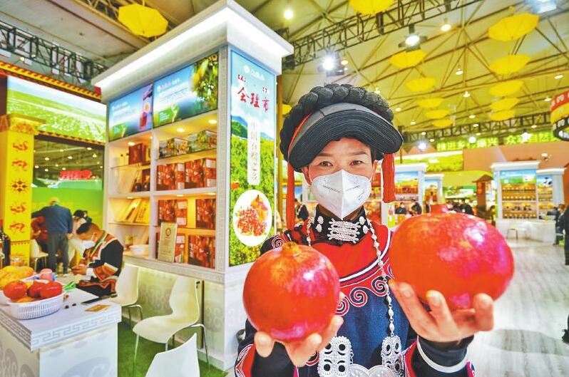12月2日,第八届四川农博会开幕当天,来自凉山州会理市的客商正在推销当地特产石榴。