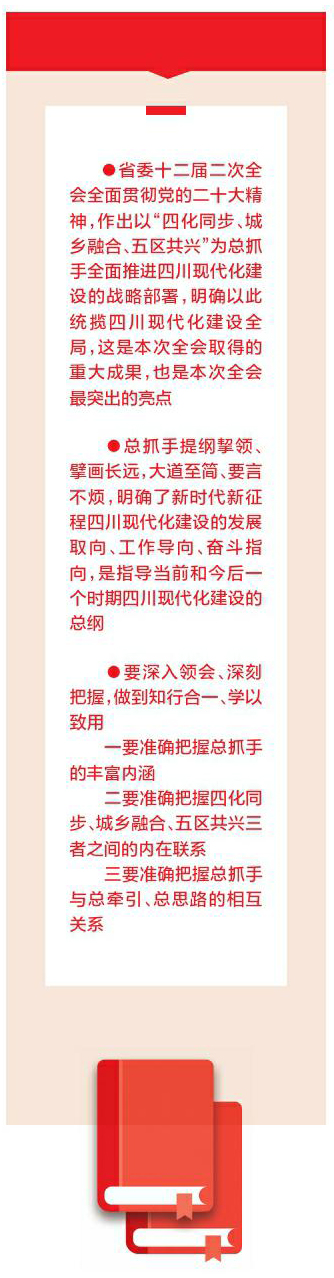省委十二届二次全会全面贯彻党的二十大精神,作出以“四化同步、城乡融合、五区共兴”为总抓手全面推进四川现代化建设的战略部署,明确以此统揽四川现代化建设全局,这是本次全会取得的重大成果,也是本次全会最突出的亮点。王晓晖书记在主题报告中,对为什么提出总抓手,总抓手内涵是什么,怎么推动总抓手落地落实,以及如何把握总抓手与总牵引、总思路之间的关系,等等,都作了深刻阐述,我们要认真学习领会,切实把思想和行动统一到省委决策部署上来。