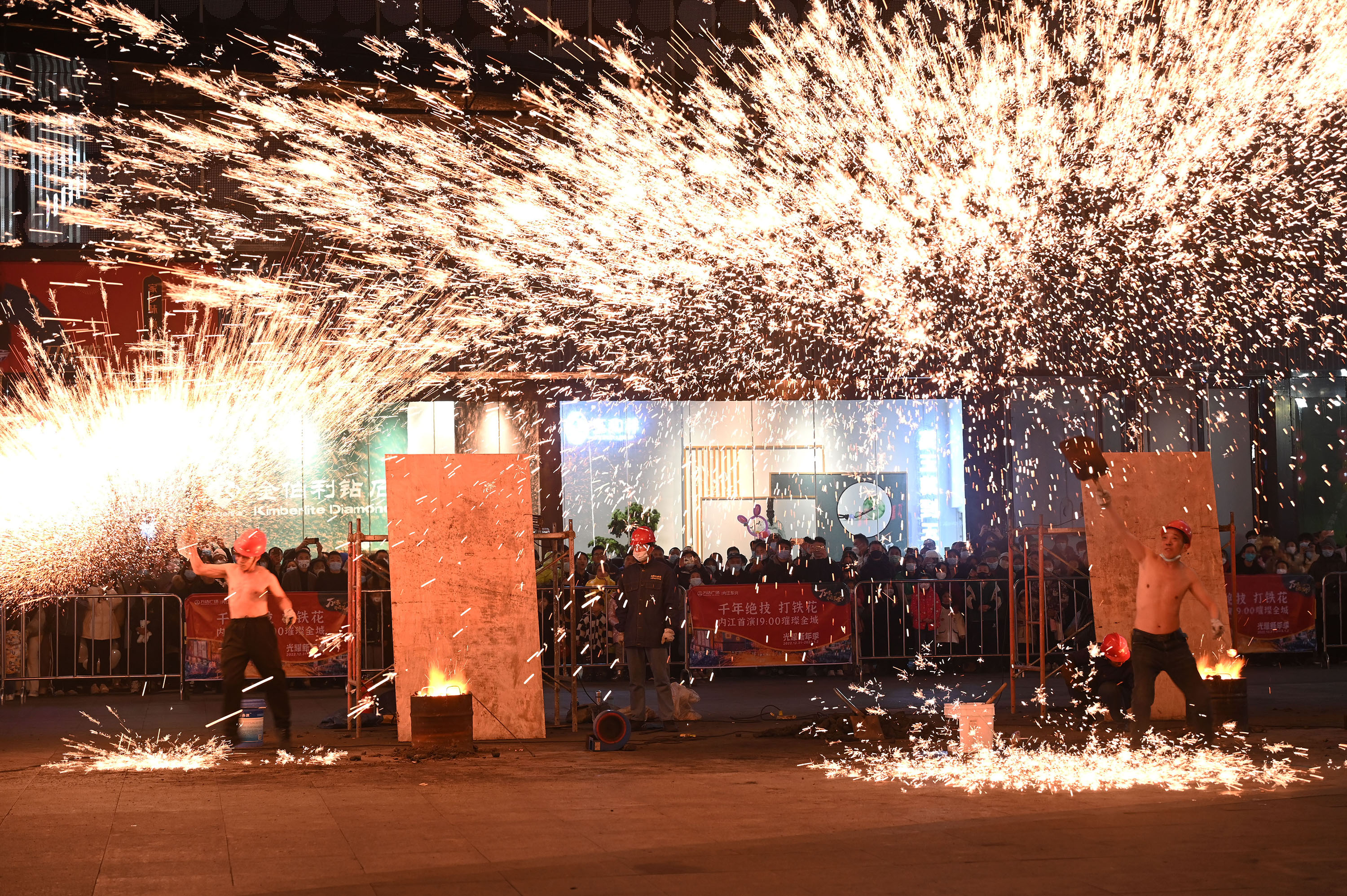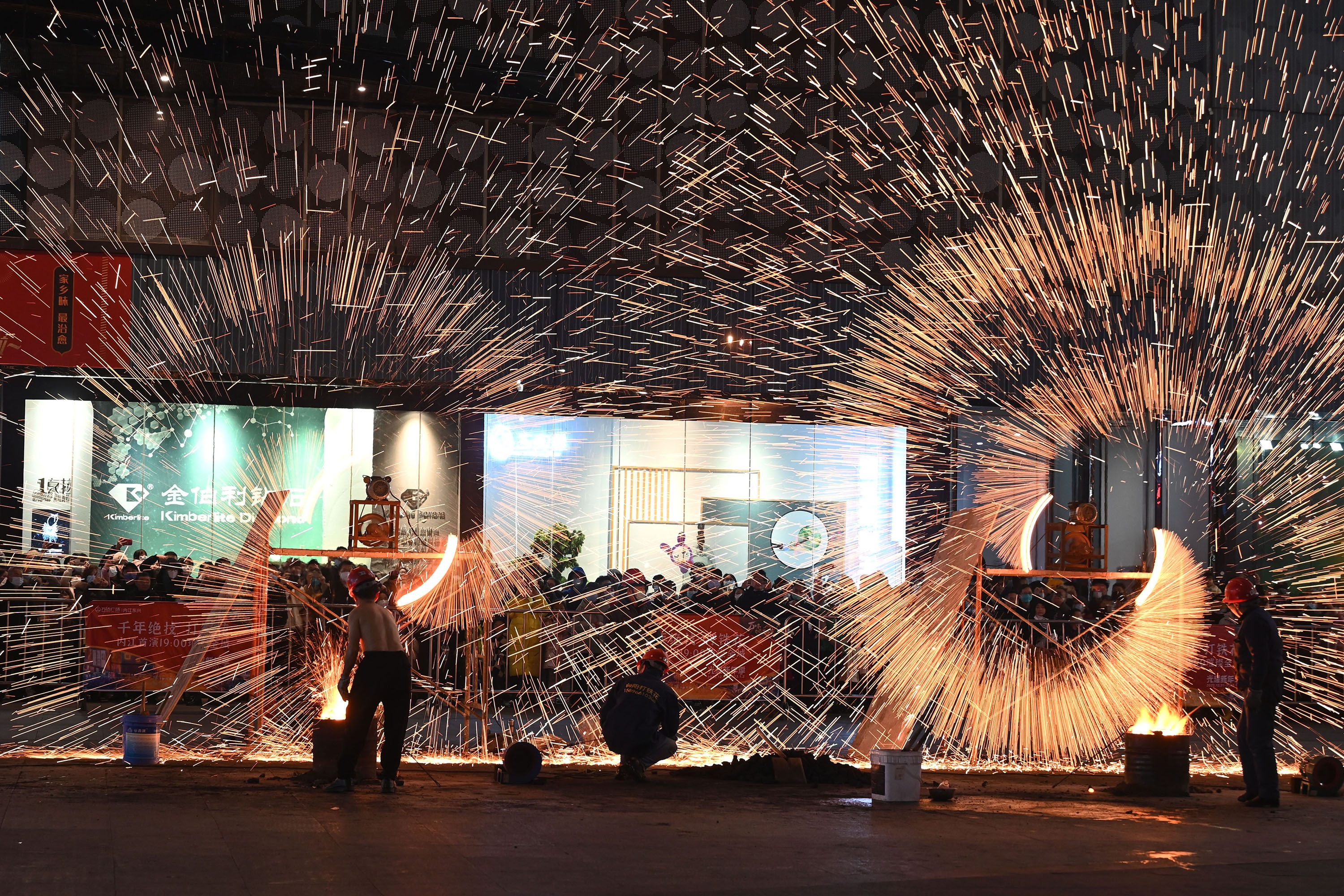 据了解,“打铁花”是中国古代匠师们在铸造器皿过程中发现的一种民俗文化表演技艺,始于北宋,盛于明清,至今已有千余年历史,现为国家级非物质文化遗产。表演时,以小炼铁炉将生铁化成铁水后,用木板将铁水打上天空,在空中形成“铁花火雨”的景象,非常壮观。