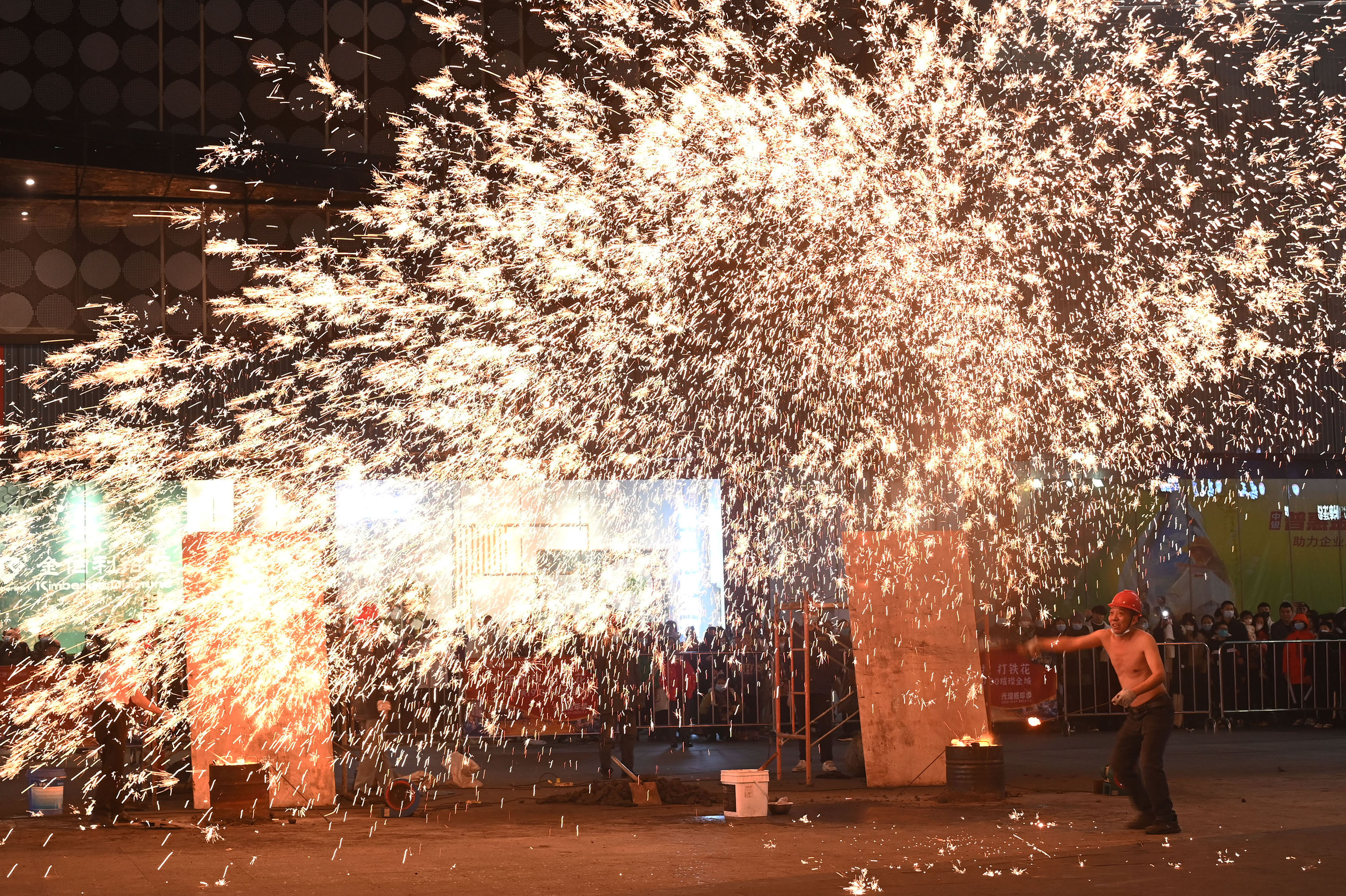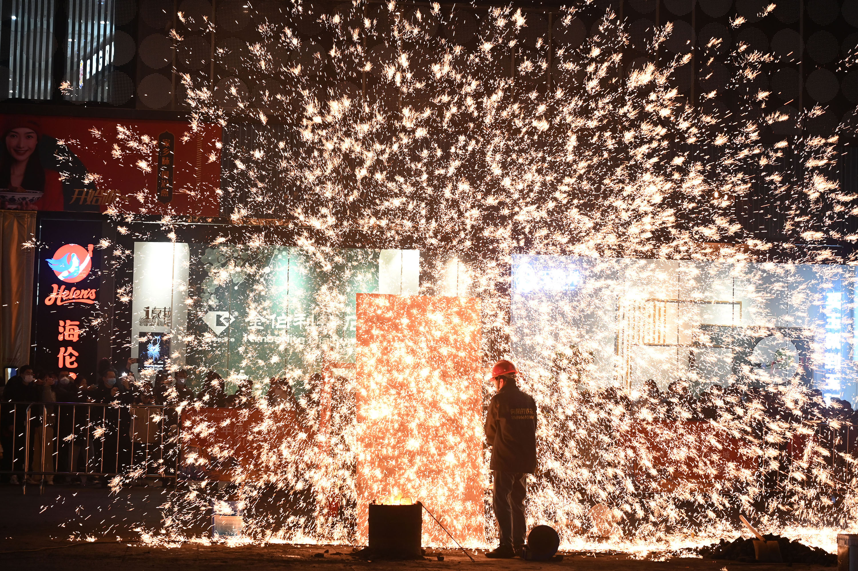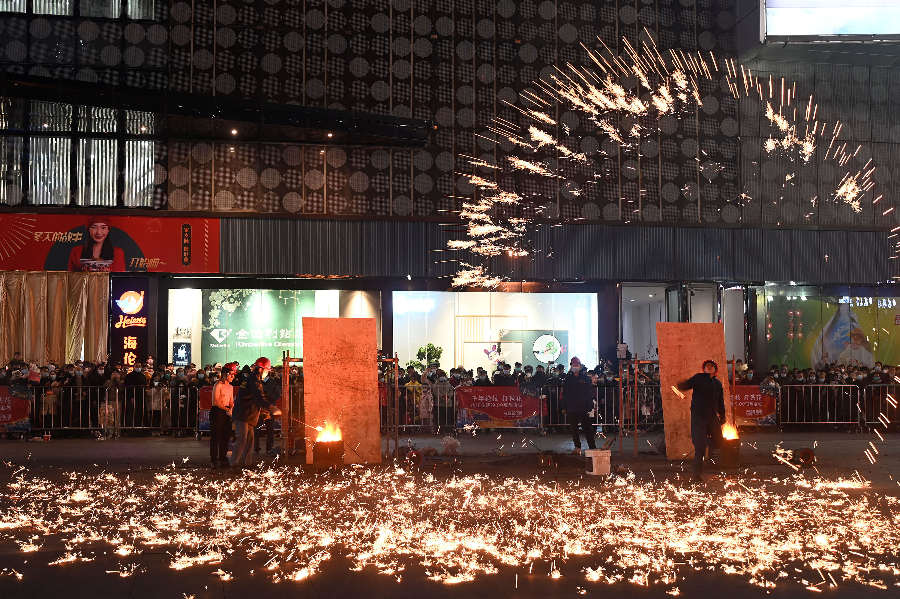 2023年1月1日晚,四川省内江市东兴区西林街道万达广场,民间艺人在表演国家级非物质文化遗产项目“打铁花”。