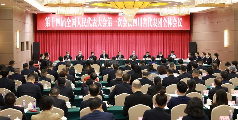 3月4日下午,十四届全国人大一次会议四川代表团在驻地举行全体会议。省委书记、省人大常委会主任、代表团团长王晓晖主持会议,省委副书记、省长、代表团副团长黄强出席。