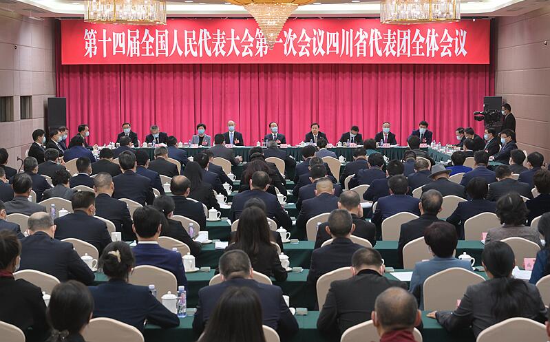 3月12日下午,十四届全国人大一次会议四川代表团在驻地举行全体会议。全国人大常委会副委员长彭清华出席会议,省委书记、省人大常委会主任、代表团团长王晓晖主持会议并讲话,省委副书记、省长、代表团副团长黄强参加。