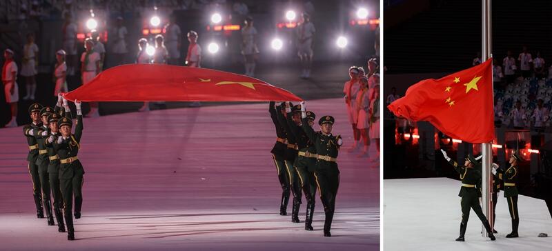 2023年7月28日,四川成都,第31届世界大学生夏季运动会开幕式在东安湖体育公园主体育场举行。图为开幕式上的升旗仪式。