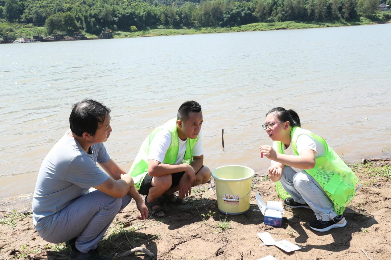 8月14日,广安区生态环境局环保志愿者在渠江边现场向大龙镇干部示范讲解如何用水质快速检测包检测水质