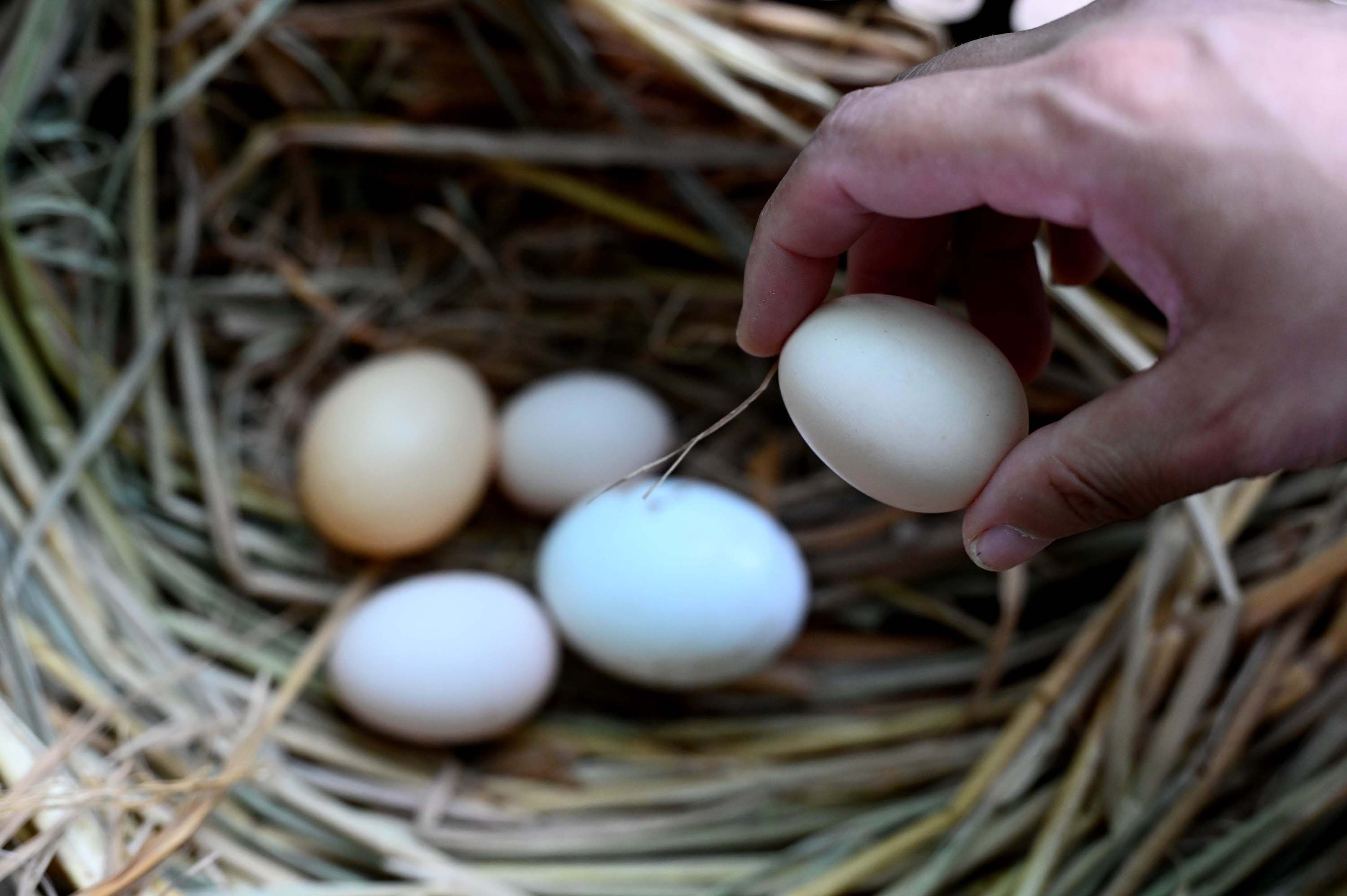 当地村民在樱花树林中的鸡舍捡拾鸡蛋