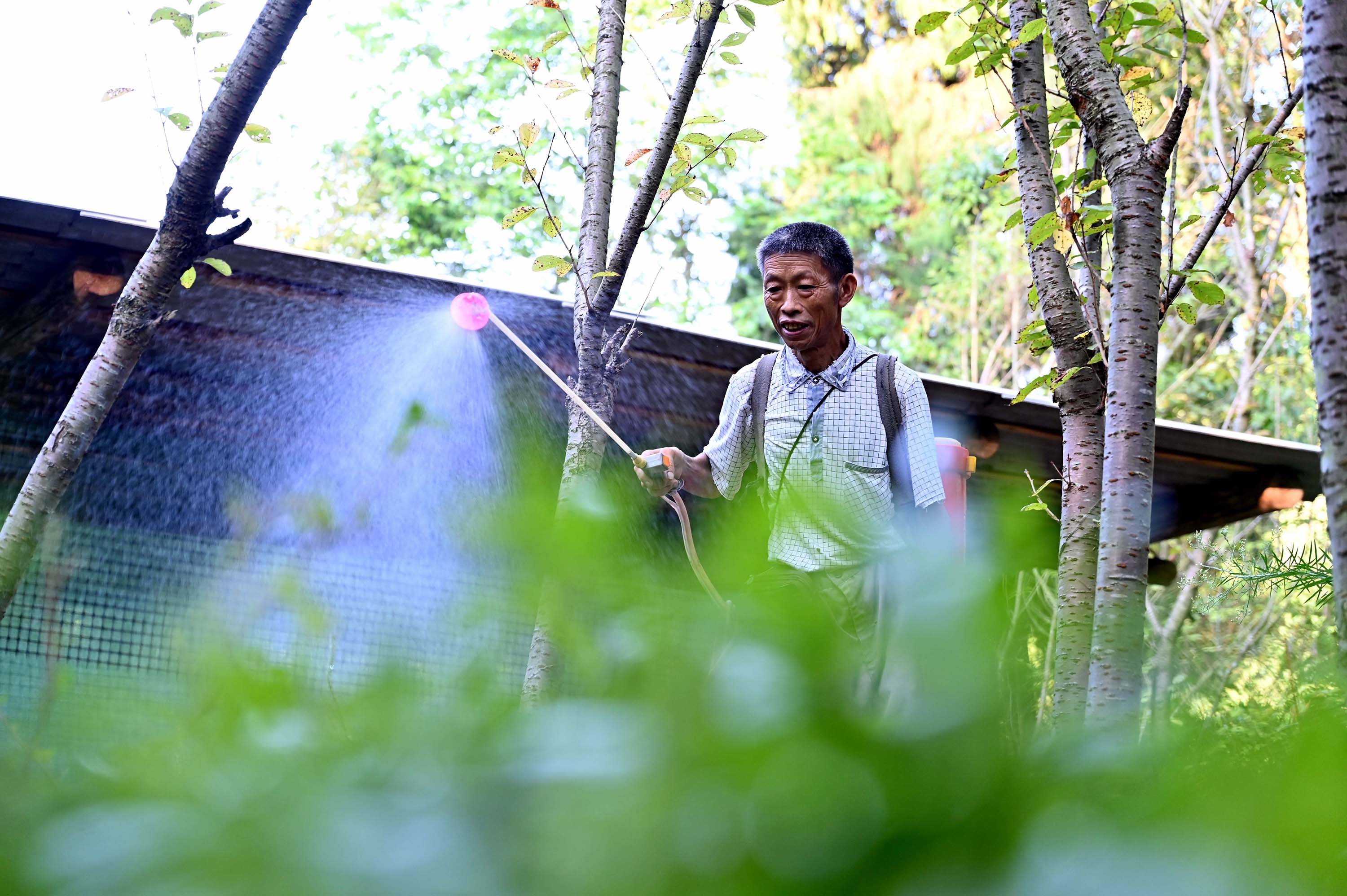 当地村民在樱花树林下为土鸡饲养场地消毒