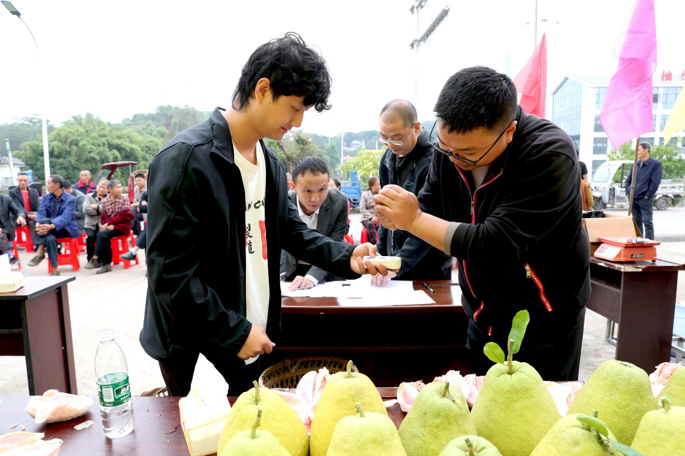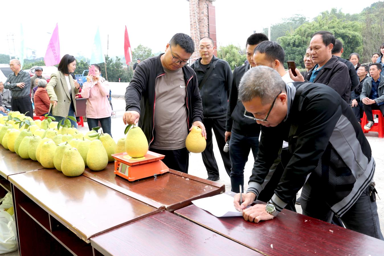 评委正在给柚果称重量