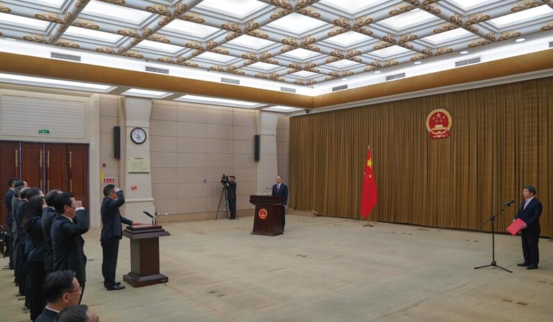 上午10时,宪法宣誓仪式开始。新一届省政府任命的50名国家工作人员整齐列队,面向国旗国徽肃立,奏唱中华人民共和国国歌。随后,领誓人手抚宪法、领诵誓词,其他宣誓人跟诵誓词。