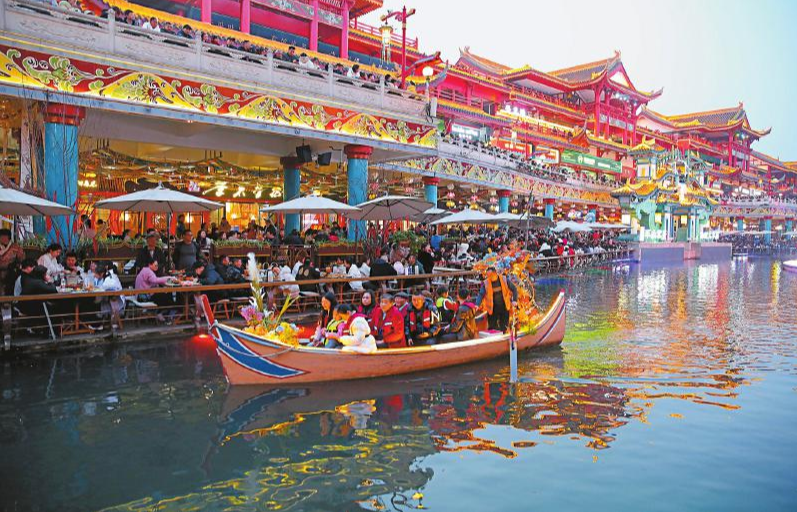 游客在眉山市东坡区穿越盛世古街乘坐游船。姚永亮 摄(C视觉)