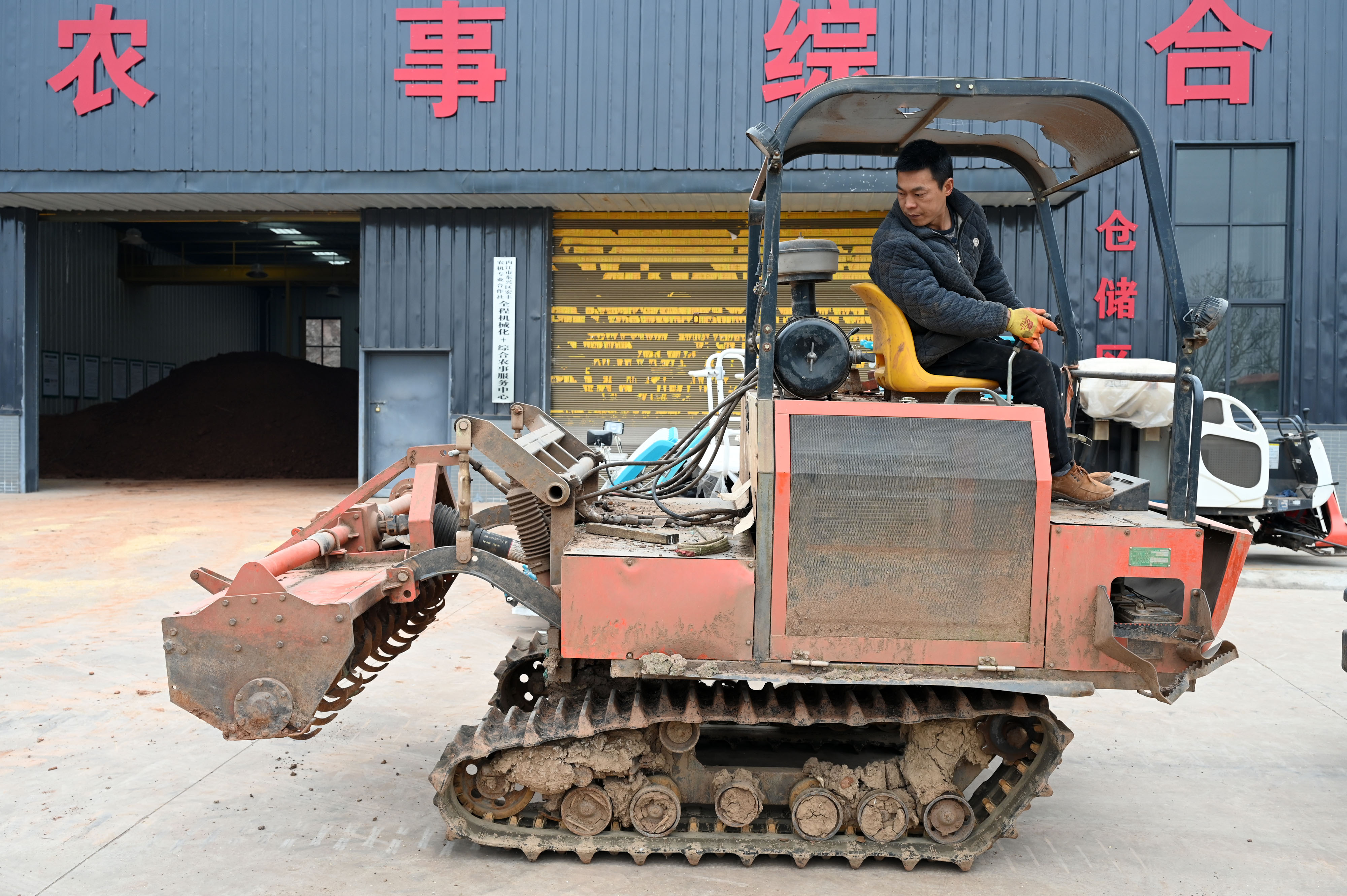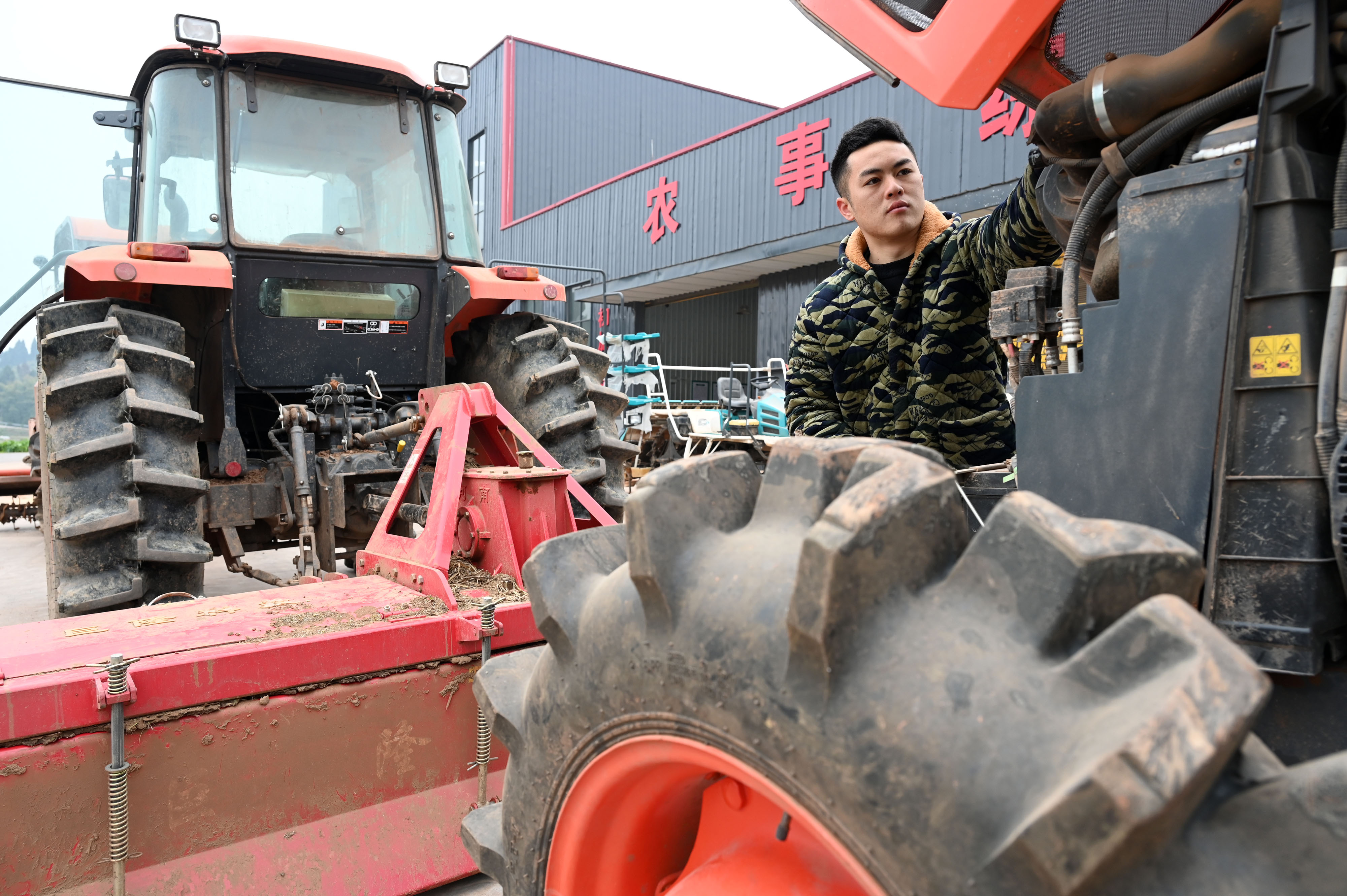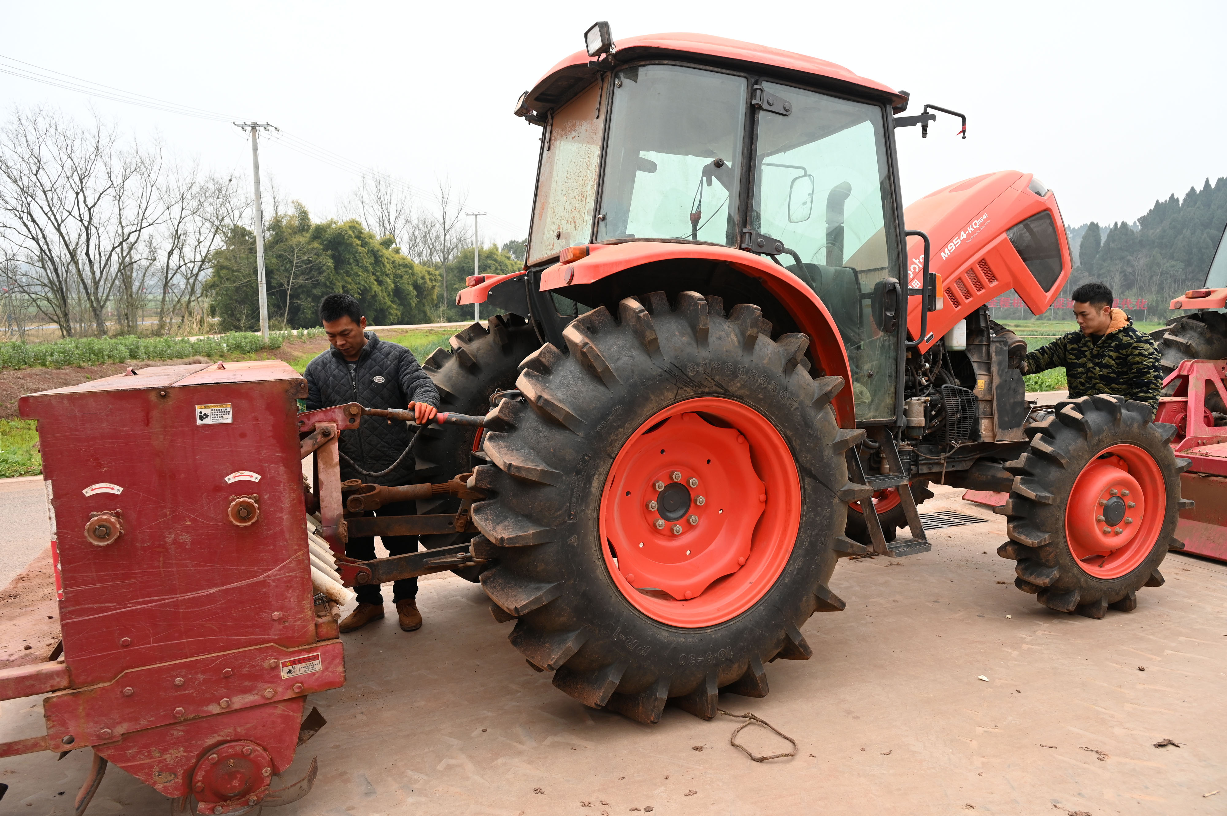 2024年2月27日,在四川省内江市东兴区田家镇正子村农事综合服务中心,农机技术人员正在检查、维护农机设备。