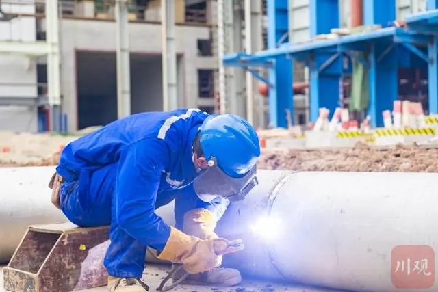工人正在进行管道和配套设施的安装(资阳观察 吴昊江摄)