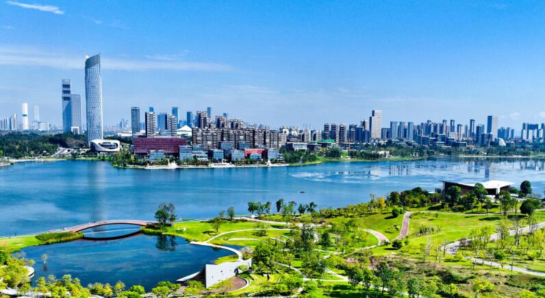 2023年5月12日,环兴隆湖畔,成都超算中心、成都科创生态岛等错落有致,一幅山水人城和谐相融的大美公园城市画卷,正在这里徐徐铺展。新华社发(四川省委宣传部提供)。
