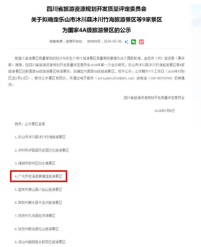 近日,四川省文化和旅游厅官网公布,根据《旅游景区质量等级的划分与评定》和《旅游景区质量等级管理办法》国家标准,由各市(州)旅资委(景评委)推荐,经四川省旅游资源规划开发质量评定委员会2024年第一次会议研究,乐山市沐川县沐川竹海旅游景区等9家旅游景区达到国家4A级旅游景区标准要求,拟确定为国家4A级旅游景区,现予公示。苍溪黄猫垭旅游景区名列其中。