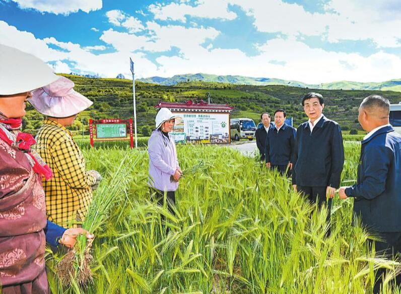 七月一日至三日,中共中央政治局常委、全国政协主席王沪宁在四川甘孜、阿坝调研。这是七月一日王沪宁在甘孜县了解青稞生产情况。新华社记者 饶爱民 摄